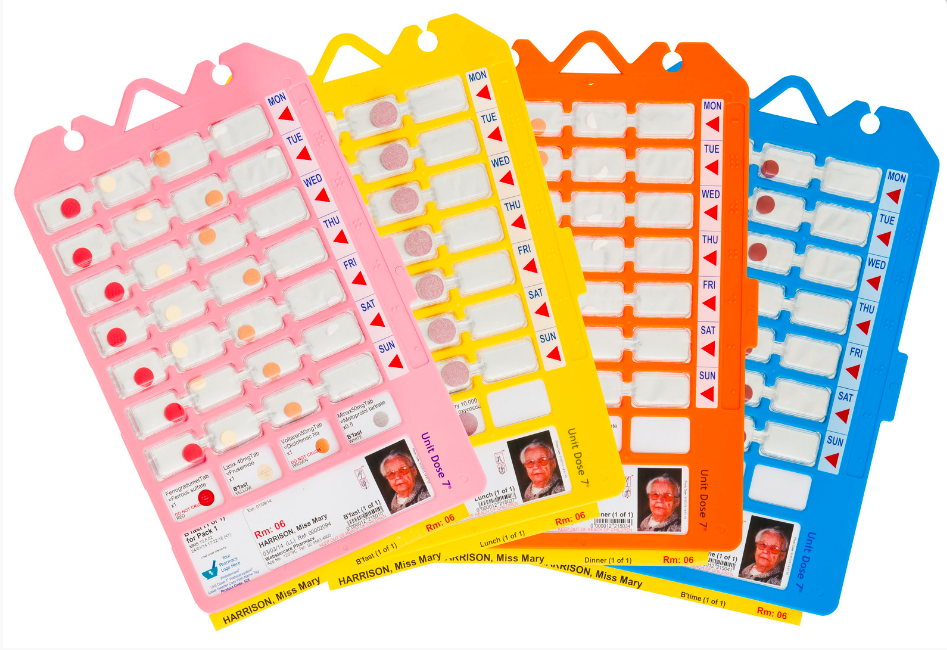 This user-friendly system is accessible to all staff members. Each Unit-Dose pack is presented in distinct colored frames that signify different times of the day: pink for breakfast, yellow for lunch, orange for dinner, and blue for night medications. Each pack also includes a clear digital colored photograph of the resident, along with their name, date of birth, room number, and other important information. Furthermore, the packs feature detailed information about each medication, including names, images, and alerts such as ‘Do Not Crush’.